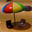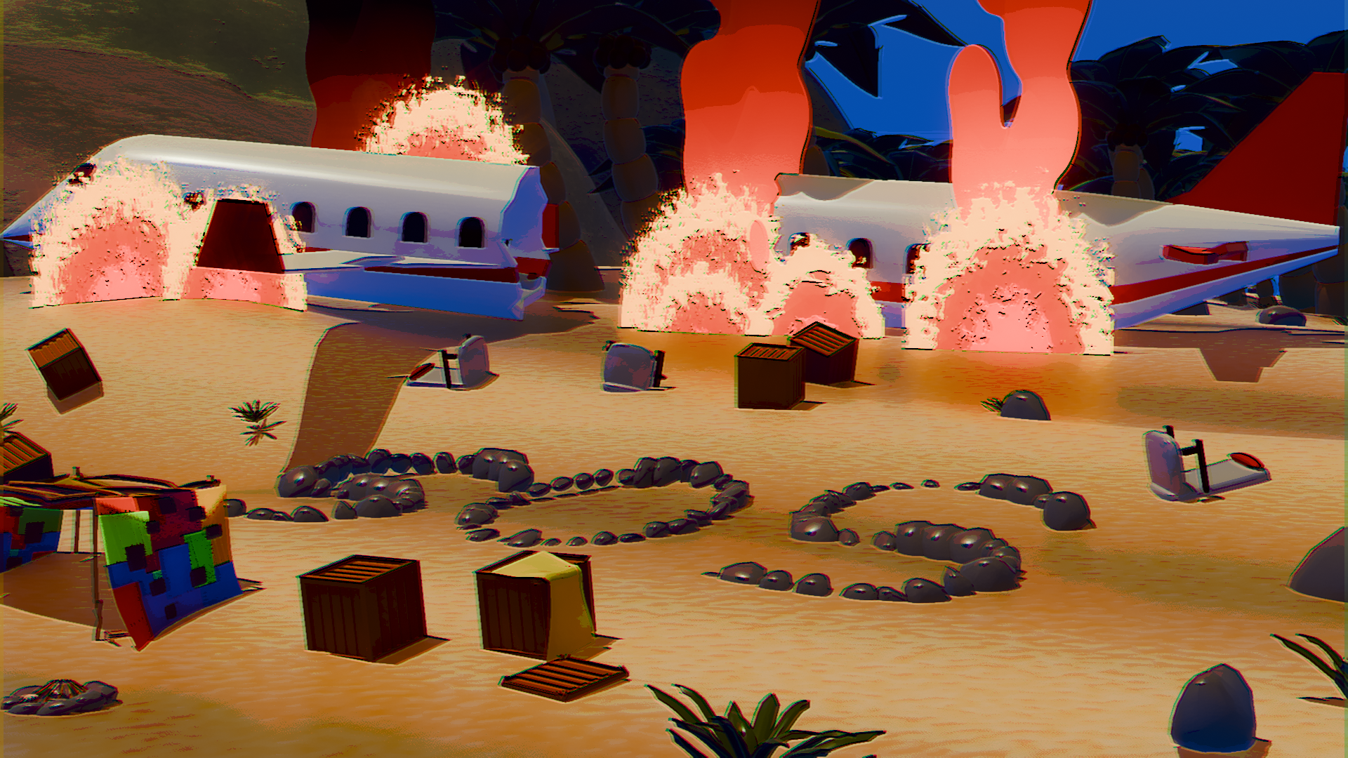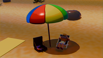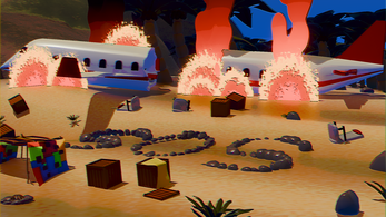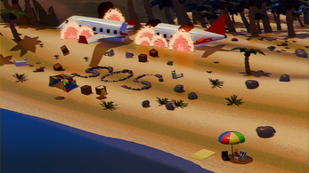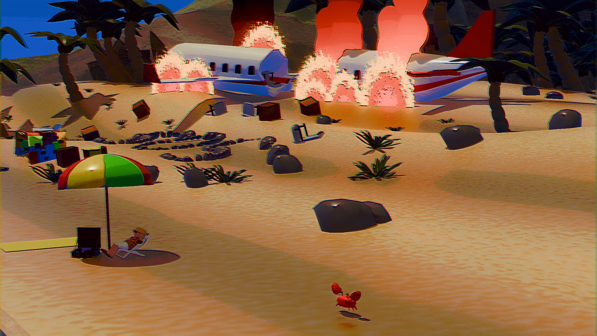 A stylized 3D animation about a man enjoying a peaceful day on the beach, completely ignoring the aviation disaster happening right behind him.